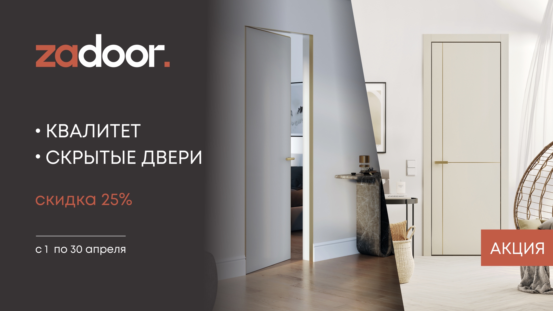 В период с 1 по 30 апреля 2026 года мы предлагаем скидку 25% на полотна и погонаж всех моделей серии Квалитет и Filomuro (кроме моделей с зеркалом) для розничных покупателей. Более подробную информацию можно уточнить у наших менеджеров или в любом салоне ZADOOR.